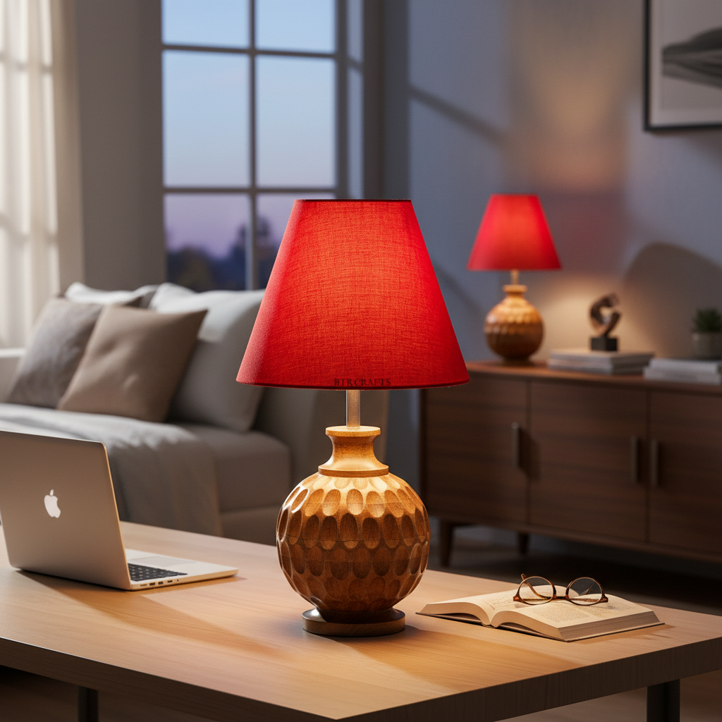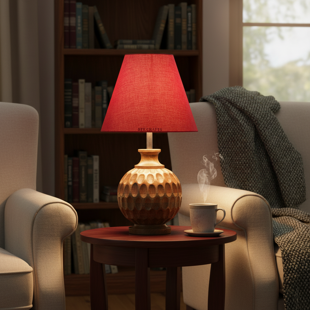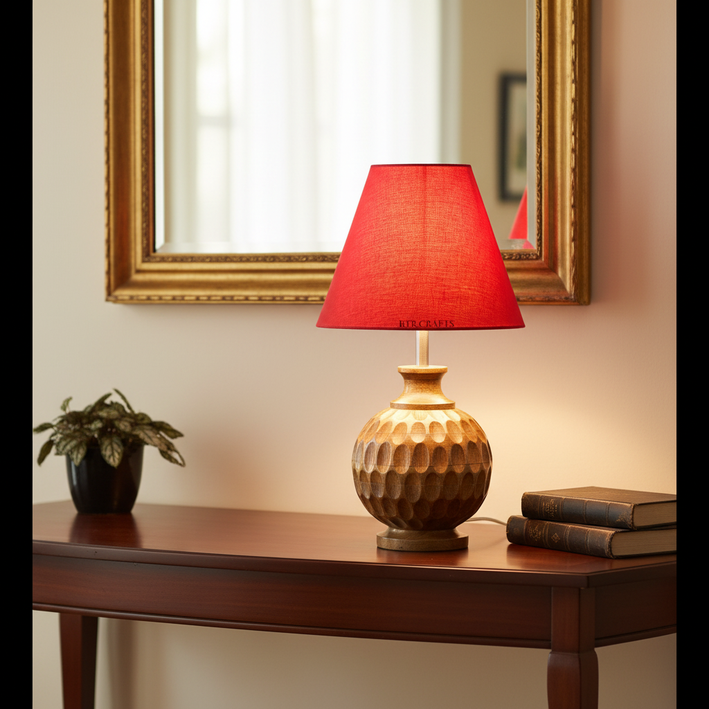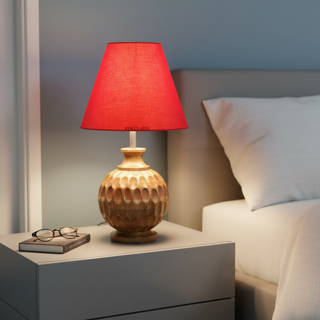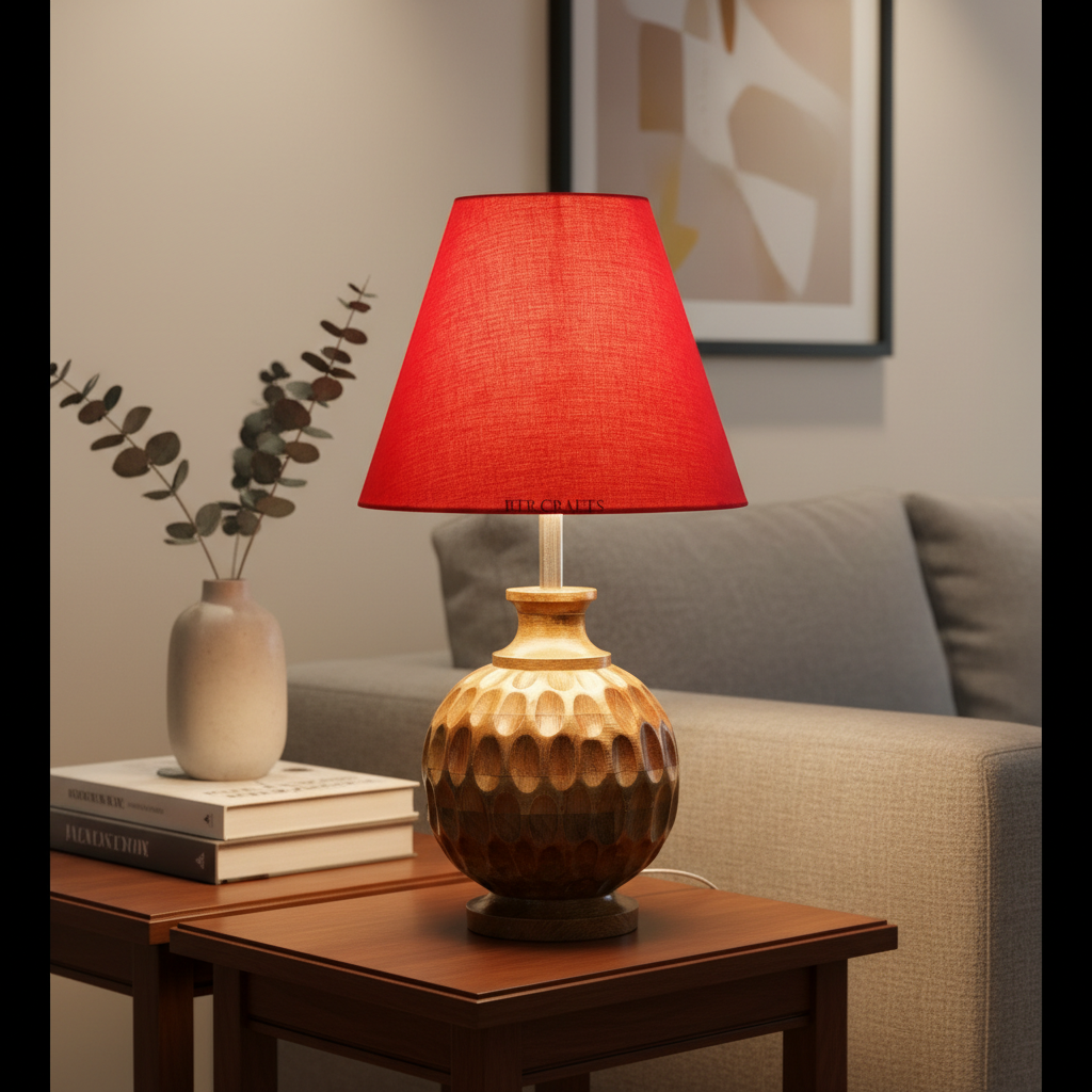 Artisan Carved Wood Table Lamp – Elegant Bedroom & Living Room Accent Light, Pack Of 1(Red)