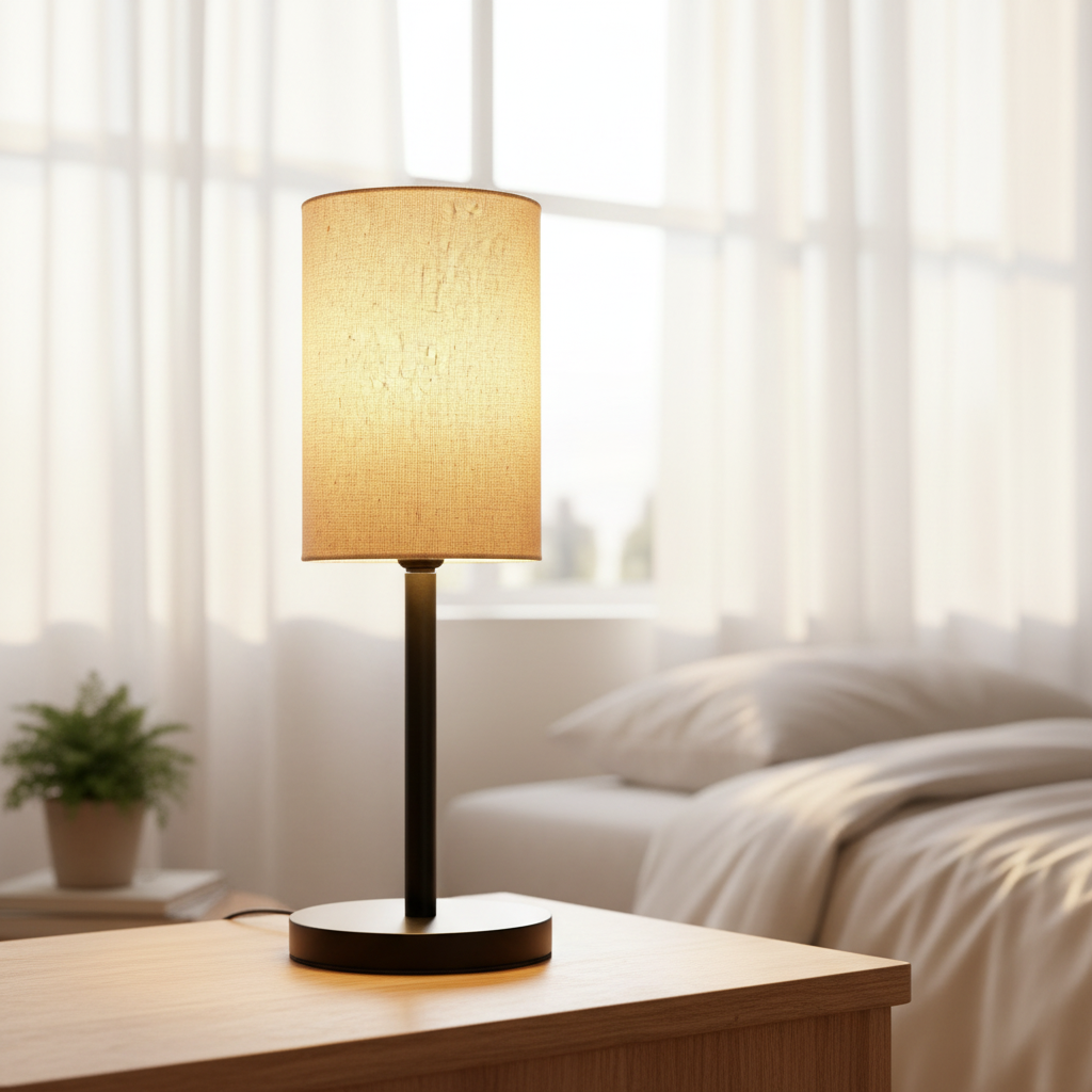 Black Bedside Lamp with Cylinder Fabric Shade Minimalist Lamp for Bedroom, Living Room & Office – Warm Ambient Nightstand Light(Natural Jute)