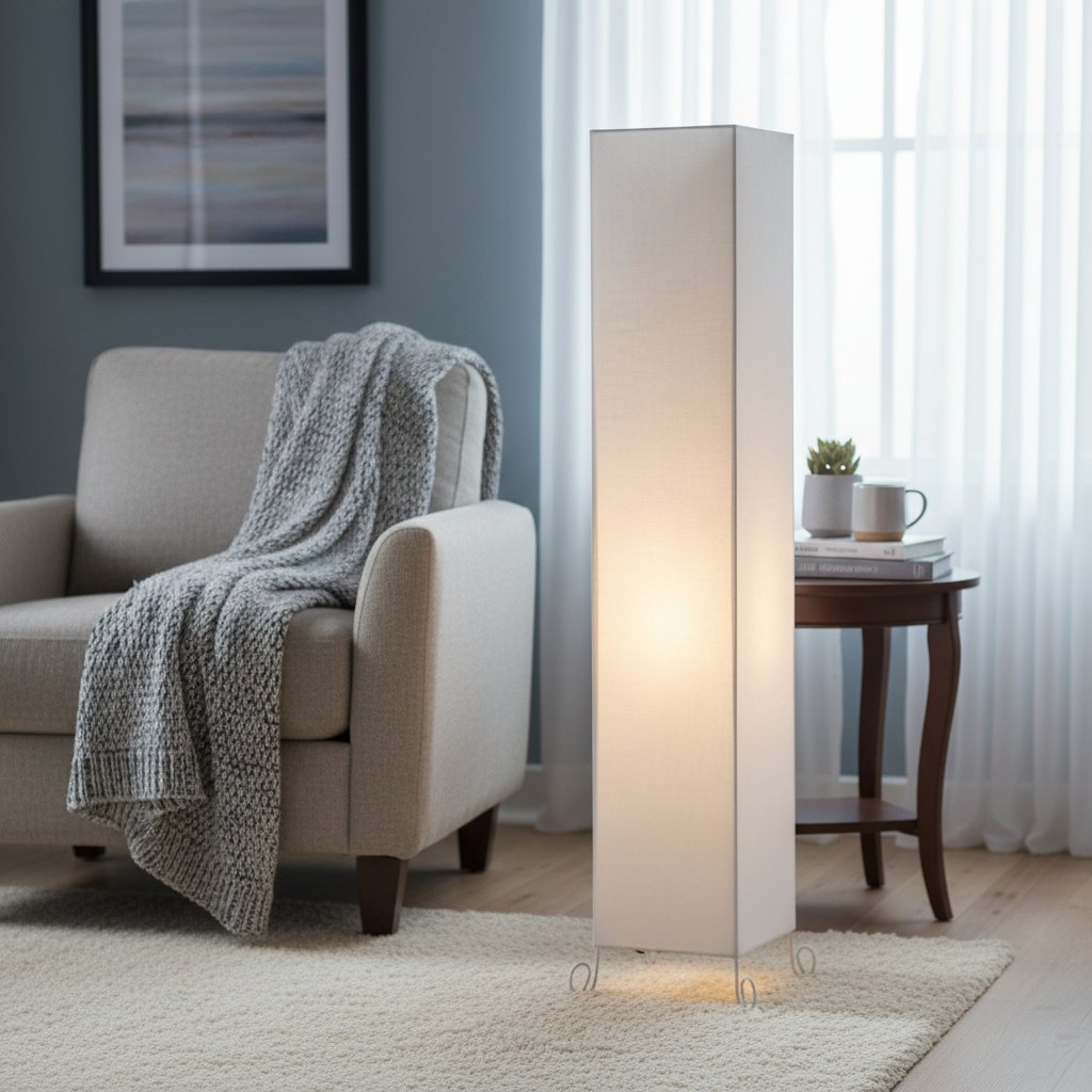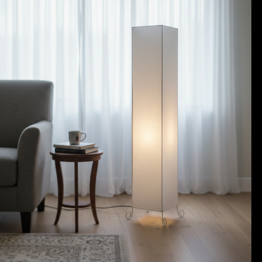 Upgrade your home décor with this Modern Square Floor Lamp, designed to create a warm and inviting atmosphere in any space. Featuring a sleek vertical tower structure with premium fabric shade and elegant metal legs, this lamp delivers soft, diffused lighting perfect for relaxing evenings or stylish interiors.