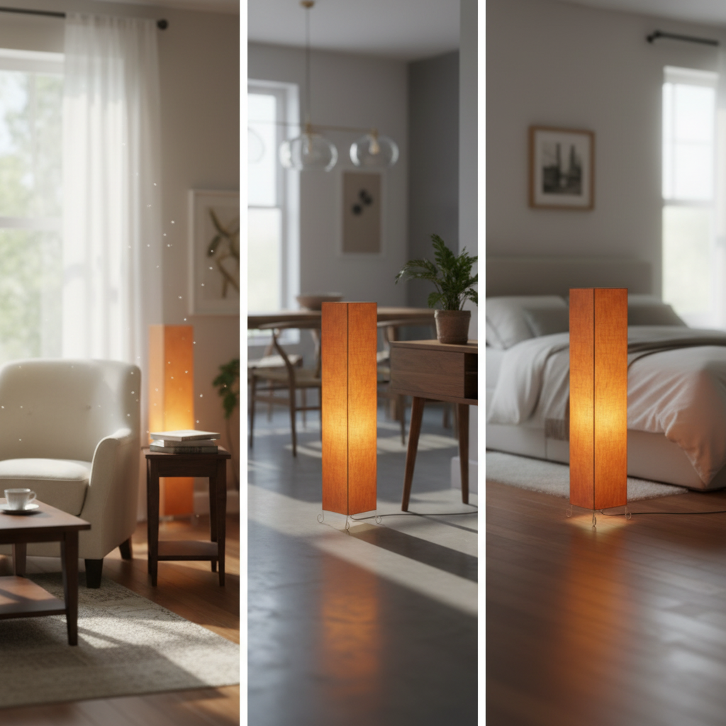 Its slim rectangular design makes it ideal for corners, beside sofas, near beds, or reading areas. Whether placed in the living room, bedroom, office, hotel suite, or lounge area, this standing lamp enhances ambiance while serving as a sophisticated décor element.